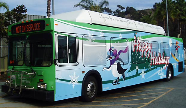 2008 Holiday Bus Graphic with Penguins playing in the snow.
