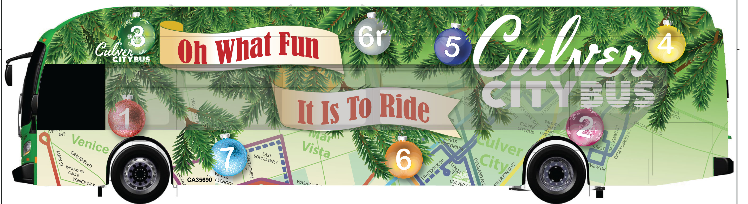 2024 Holiday Bus Graphic “Oh What Fun It Is To Ride” hints at the holiday with tree limbs and ornaments. Transit is represented the system map.