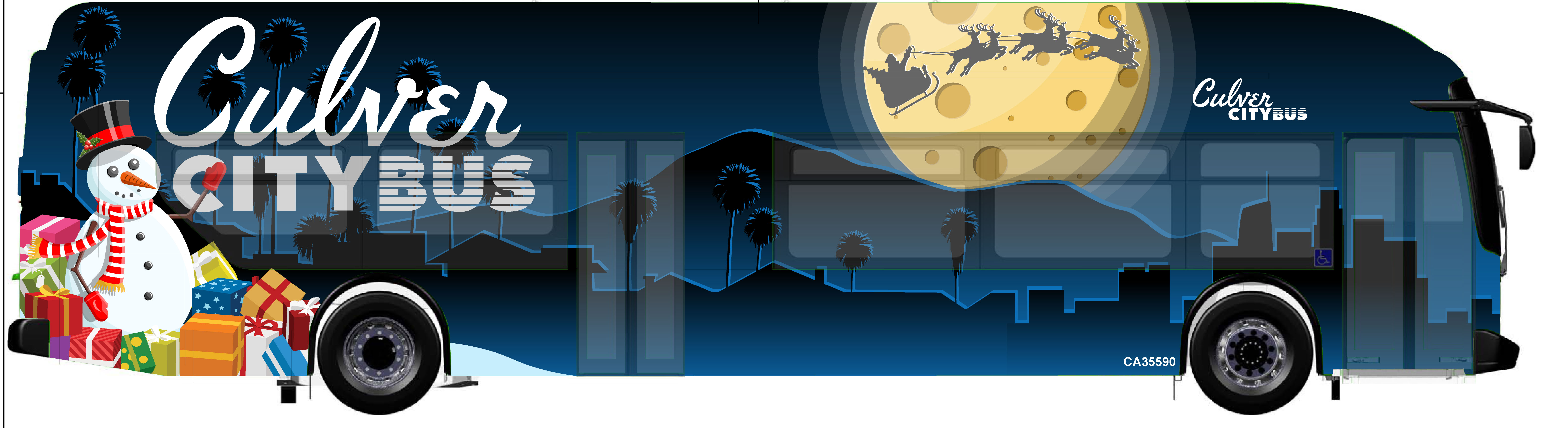 2022 Holiday Bus Graphic showing a Snowperson with gifts under a So California night sky with Santa and his reindeer soaring above.